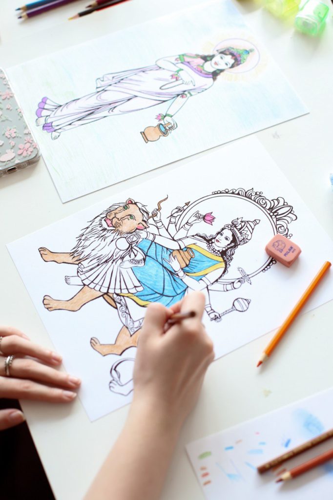 神や神聖な存在の姿を描いたり、色を塗ることに完全に夢中になることで、感覚が神聖なものに魅了され、世俗から離れて、神や神聖な存在に焦点を合わせることができるようになっていきます。